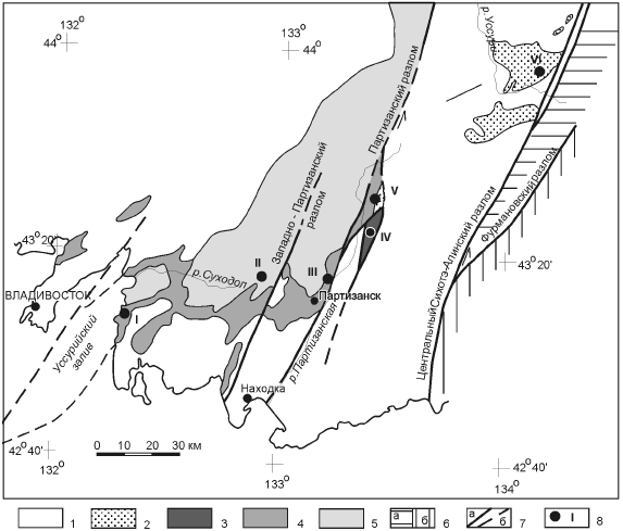 В бассейне выделяется также Западно-Партизанский разлом (см. рис. 6.12), который ограничивает с запада область распространения сучанской серии, имеющей промышленную угленосность (Лихт, 1973).
