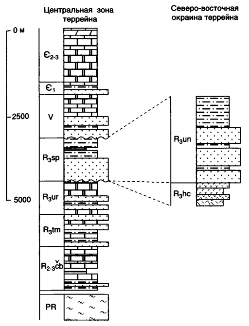 Рис.7.26. Стратиграфические колонки рифейских и венд-кембрийских отложений Приколымского миогеоклинального террейна