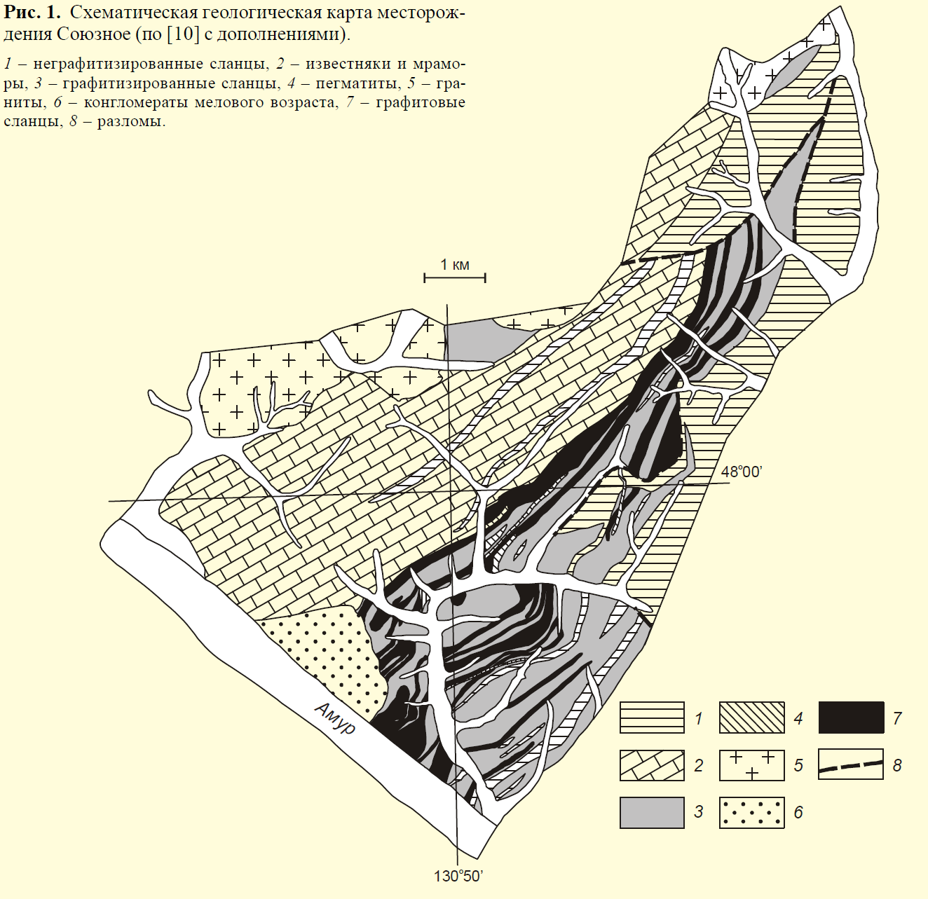 Союзное месторождение[1] графита расположено в Кимканском прогибе Буреинского массива, сложенного терригенными, кремнисто-терригенно-карбонатными и кремнисто-терригенными формациями верхнего рифея–нижнего кембрия, и представляет собой чередование более десятка пластов высокоуглеродистых пород со средним содержанием графита 16–18 %. Площадь месторождения – 60 км2 (рис. 1).