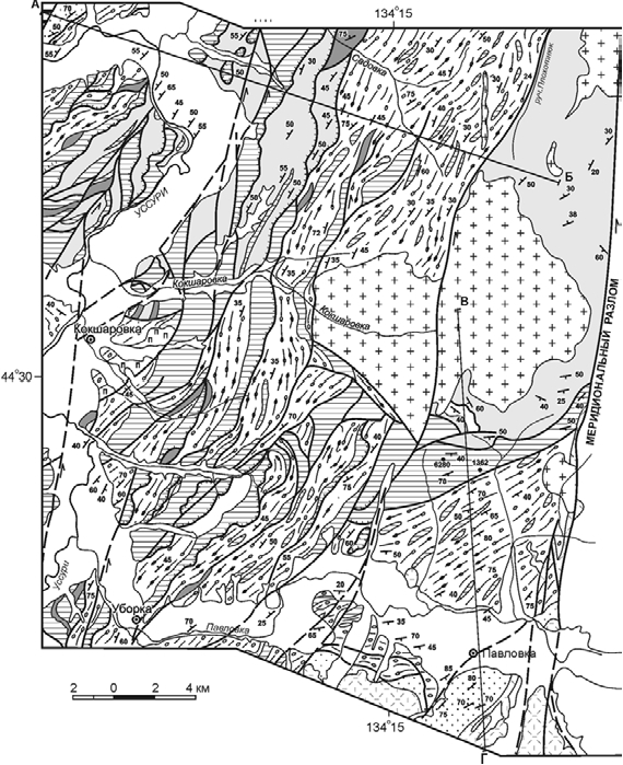 Рис. 4.33. Нижние структурные уровни Самаркинского террейна - фрагмента аккреционной призмы в приустьевой части р. Павловка. Положение района см. на рис. 4.32.