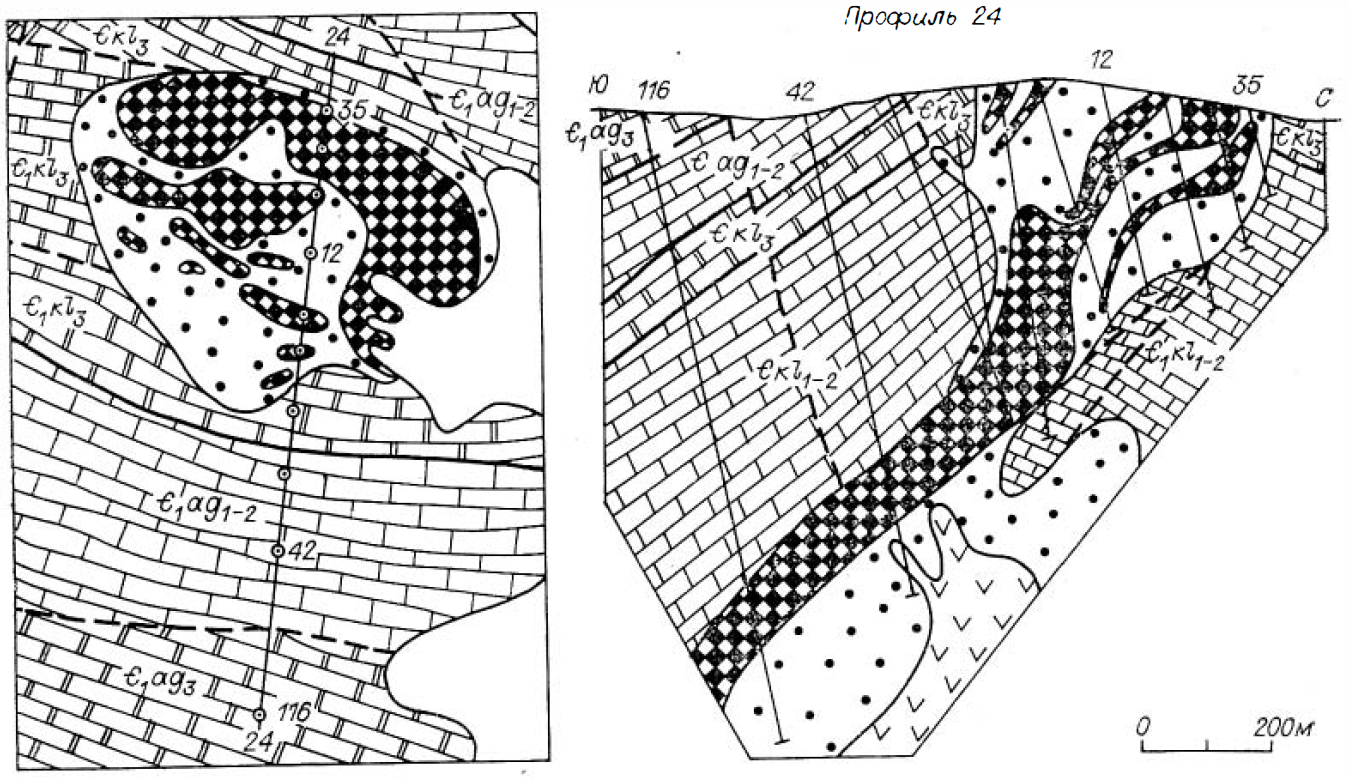 Рис.79. Огненское месторождение. Геологический план и разрез по разведочному профилю 24.